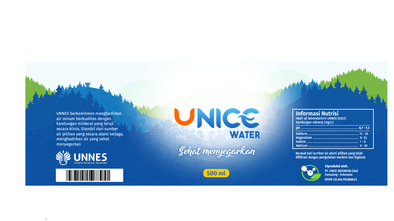 UNICE Bottled Water Packaging Design is a packaging design project developed for Universitas Negeri Semarang (UNNES). The visual concept is primarily dominated by blue tones, complemented with subtle green accents to symbolize natural freshness, purity, and environmental awareness. The design was created to convey a clean and modern institutional identity while maintaining an association with healthy and refreshing mineral water. The final design was implemented on 250 ml bottled water packaging, ensuring visual clarity, brand recognition, and practicality for everyday use.